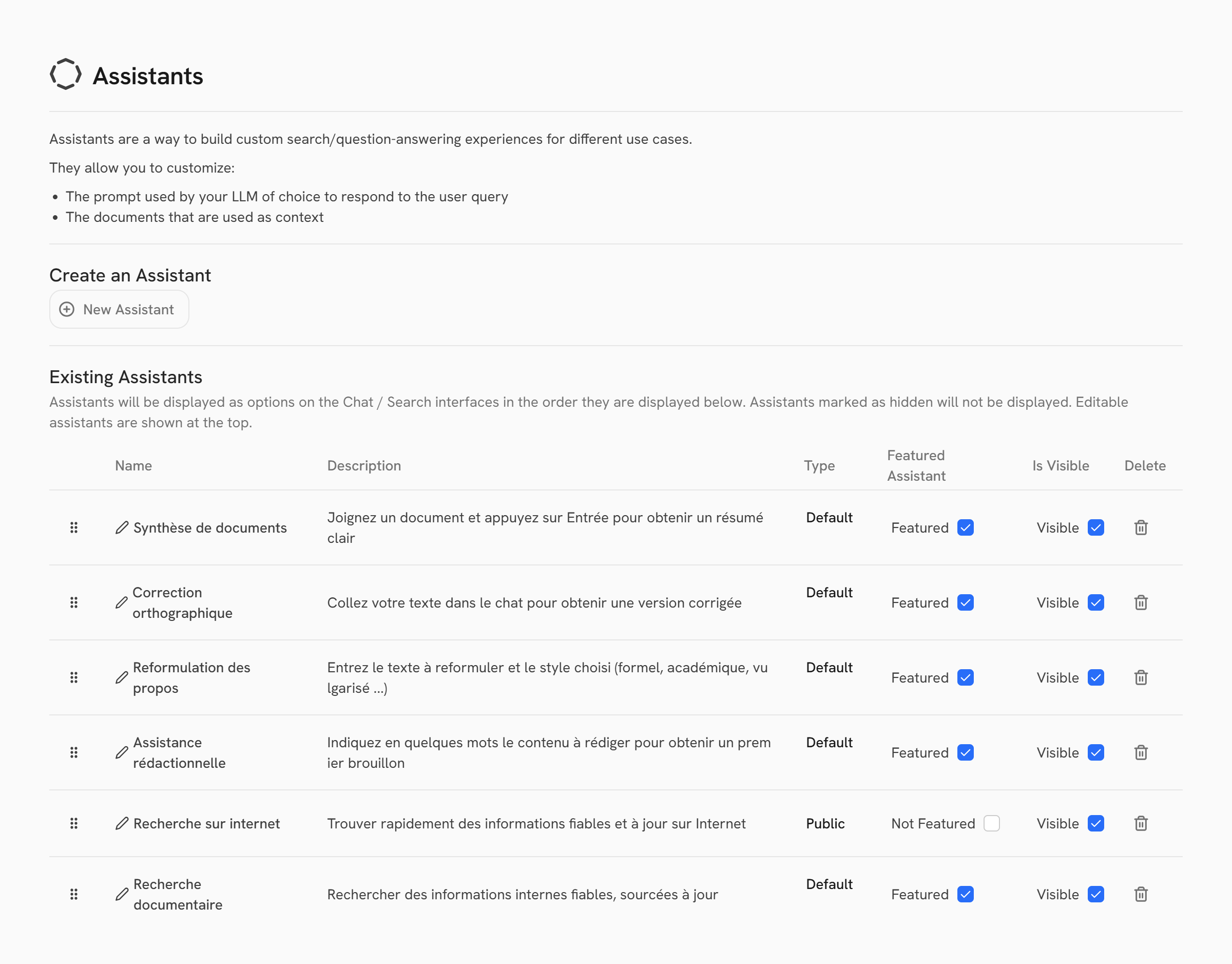 Les administrateurs Craft AI peuvent aussi choisir quels assistants seront "Featured", c'est à dire épinglés dans la barre latérale des utilisateurs, et lesquels seront "Visible", ils seront alors ou non visibles dans l'explorateur d'assistants. Ils peuvent aussi modifier les assistants et les supprimer.