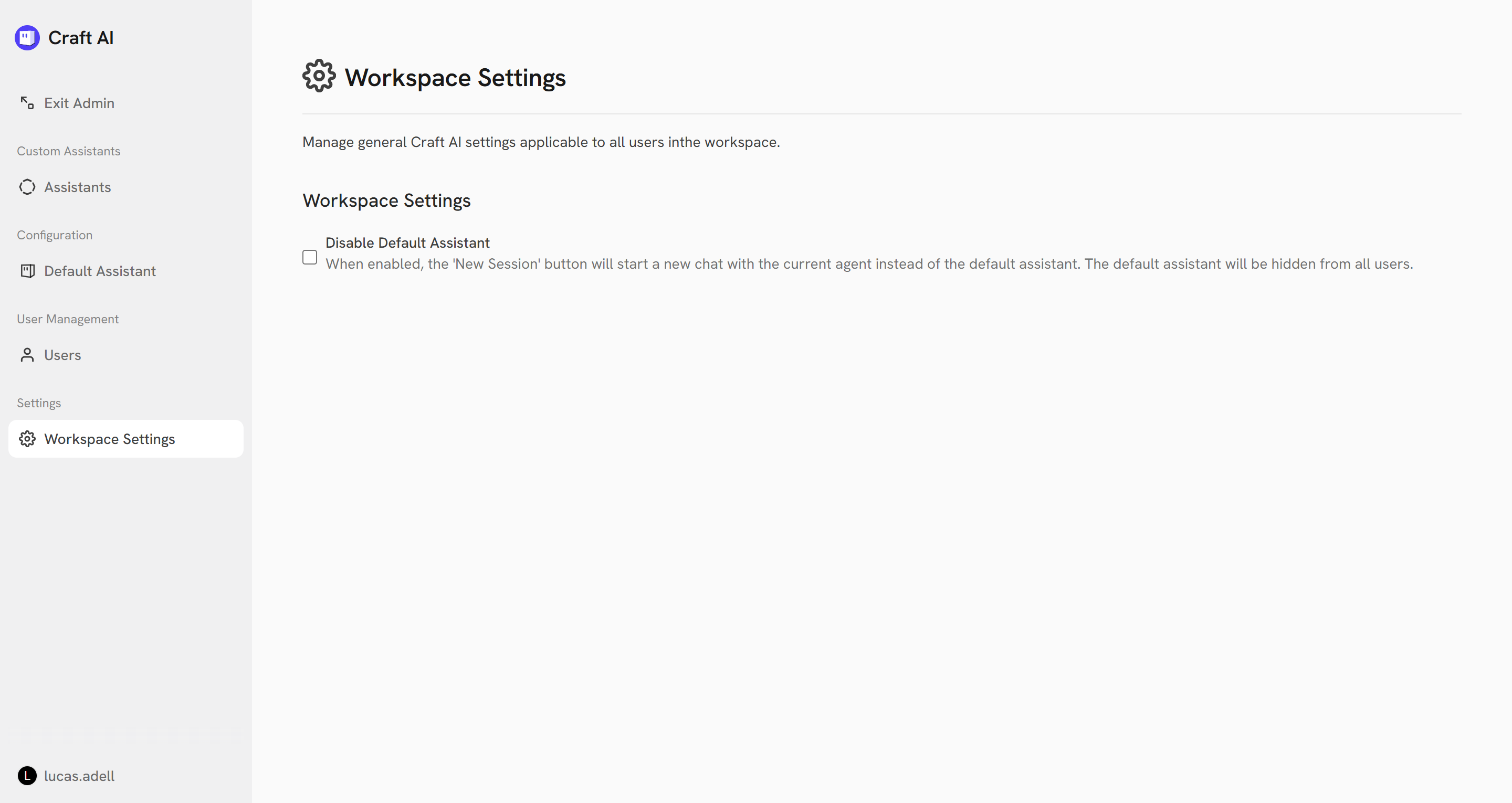 Vous pouvez aussi choisir de désactiver l'assistant par défaut dans la partie "Workspace Settings" de l'espace d'administration. Si vous choisissez de le faire, vos utilisateurs n'auront plus accès à l'assistant par défaut et lorsqu'ils cliqueront sur "Nouvelle conversation" le dernier assistant consulté sera automatiquement sélectionné.