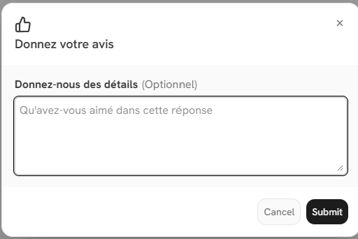 Afin de participer à l'évaluation de l'assistant, vous pouvez cliquer sur le bouton "pouce vers le haut" ou "pouce vers le bas" sous une de ses réponses afin de donner votre avis sur sa qualité.