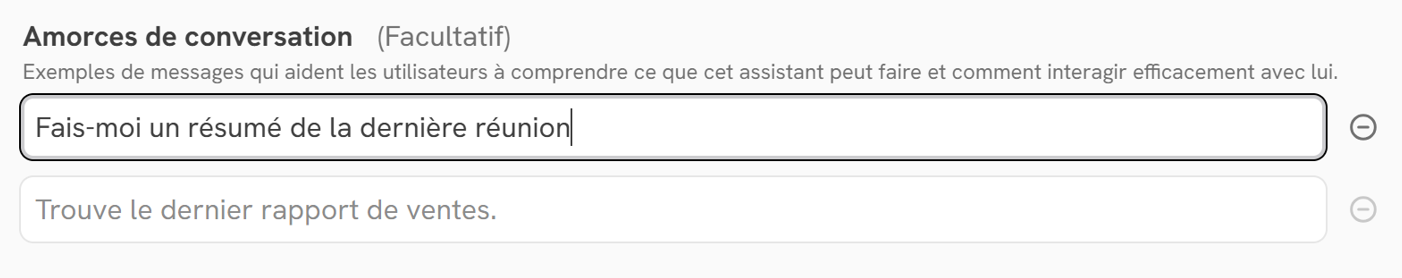 Les amorces de conversation sont des prompts préconfigurés par le créateur de l'assistant qui s'affichent sous le champ de saisie du chat :